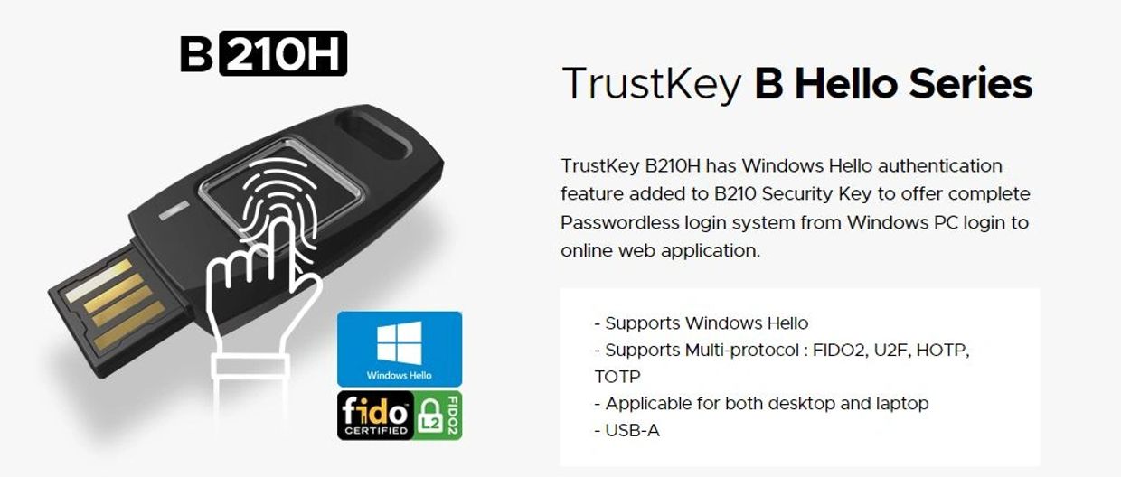 TrustKey B Series keys are the World’s first and only FIDO 2 Level 2 Certified Security Keys Since the Fingerprint data are stored in the Secure Storage, they never leave the key during the authentication The fingerprint recognition supports Multi Factor Authentication as well as Passwordless Authentication